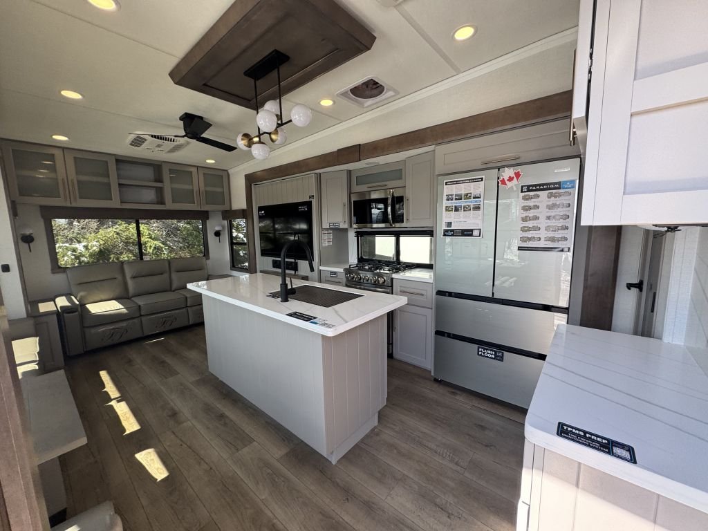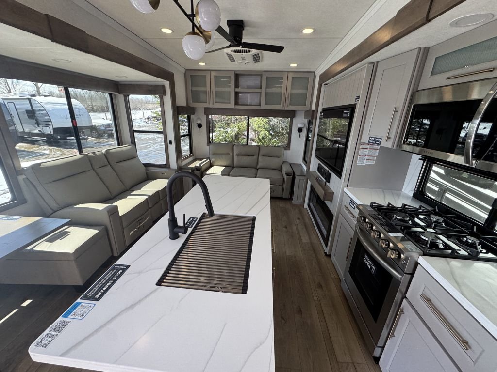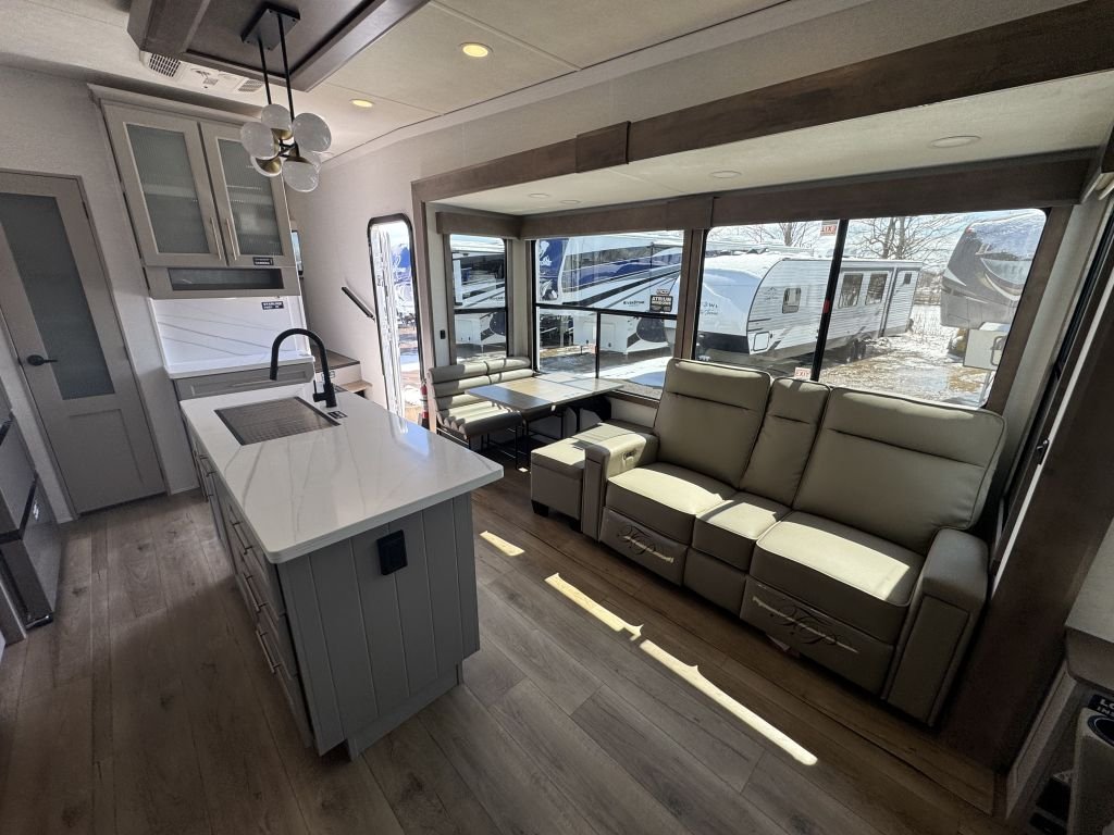 Alliance RV has prioritized comfort with plush, power theater seating positioned across from a newly designed entertainment center. The large atrium windows flood the living area with natural light, creating a warm and welcoming atmosphere. The TV has been updated to pivot for optimal viewing angles, accommodating those relaxing evenings spent enjoying your favorite shows. Additionally, all TVs are now 4K smart TVs, ensuring that you have the latest technology at your fingertips.