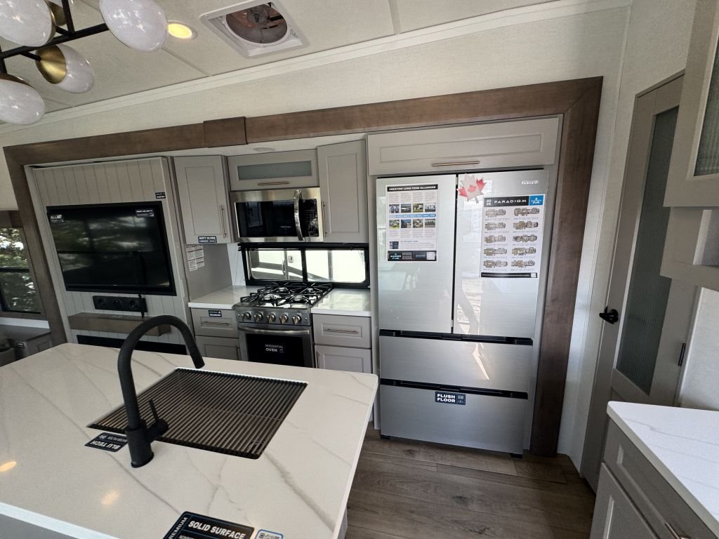 The kitchen is a highlight of any RV, and Alliance has not skimped on features here. With a symmetrical layout, dual power outlets on either side of the stove, and a high-capacity Insignia stove top, meal preparation is a breeze. The solid surface countertops add an elegant touch while providing ample workspace. Plus, the kitchen island is prepped for a dishwasher, enhancing functionality for longer stays. Whether you’re whipping up a quick breakfast or a gourmet dinner, you’ll find everything you need right at your fingertips.