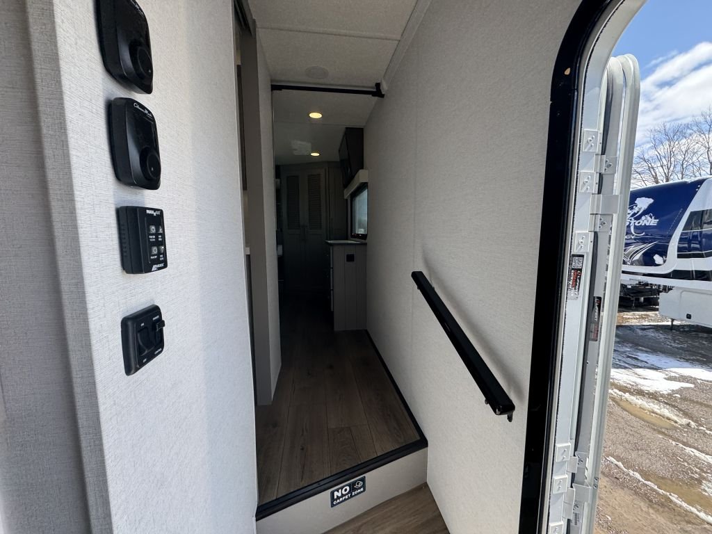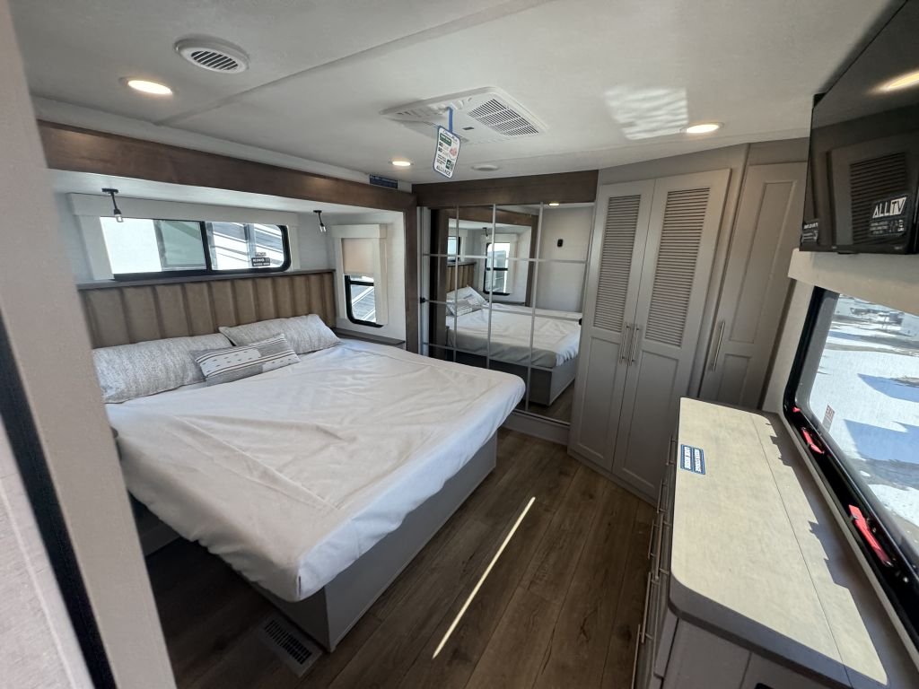 The bedroom area doesn’t disappoint either. Available with a king-size bed option, it includes convenient bedside phone stands and a large front closet that can accommodate either a combo or stackable washer-dryer setup. The room is designed for maximum comfort, with extra storage beneath the bed for added convenience. You’ll find a second 4K TV angled perfectly for easy viewing, ensuring that you can unwind in style after a day of adventure.