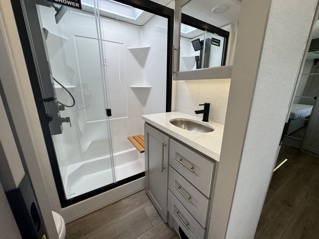 Moving to the bathroom, you’ll appreciate the generous headroom and thoughtful design elements, such as the soft-close toilet lid that minimizes noise. The spacious shower features excellent water drainage and a waterproof epoxy countertop, paired with ample storage for toiletries. The bathroom is equipped with a rain-sensor fan, ensuring proper ventilation while you're cooking or showering. This attention to detail makes every aspect of your experience comfortable and convenient.