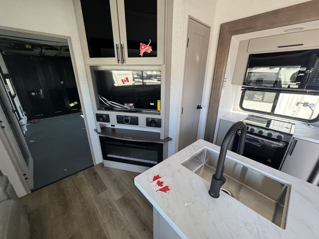 Across from the living area is a well-equipped kitchen with features you’d expect for real meal prep on the road: