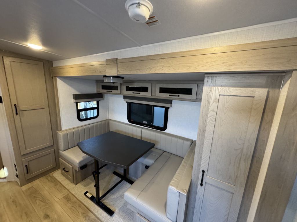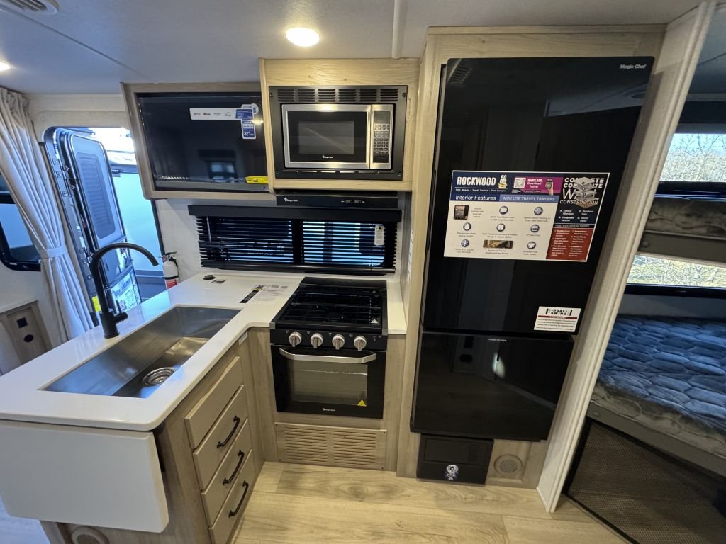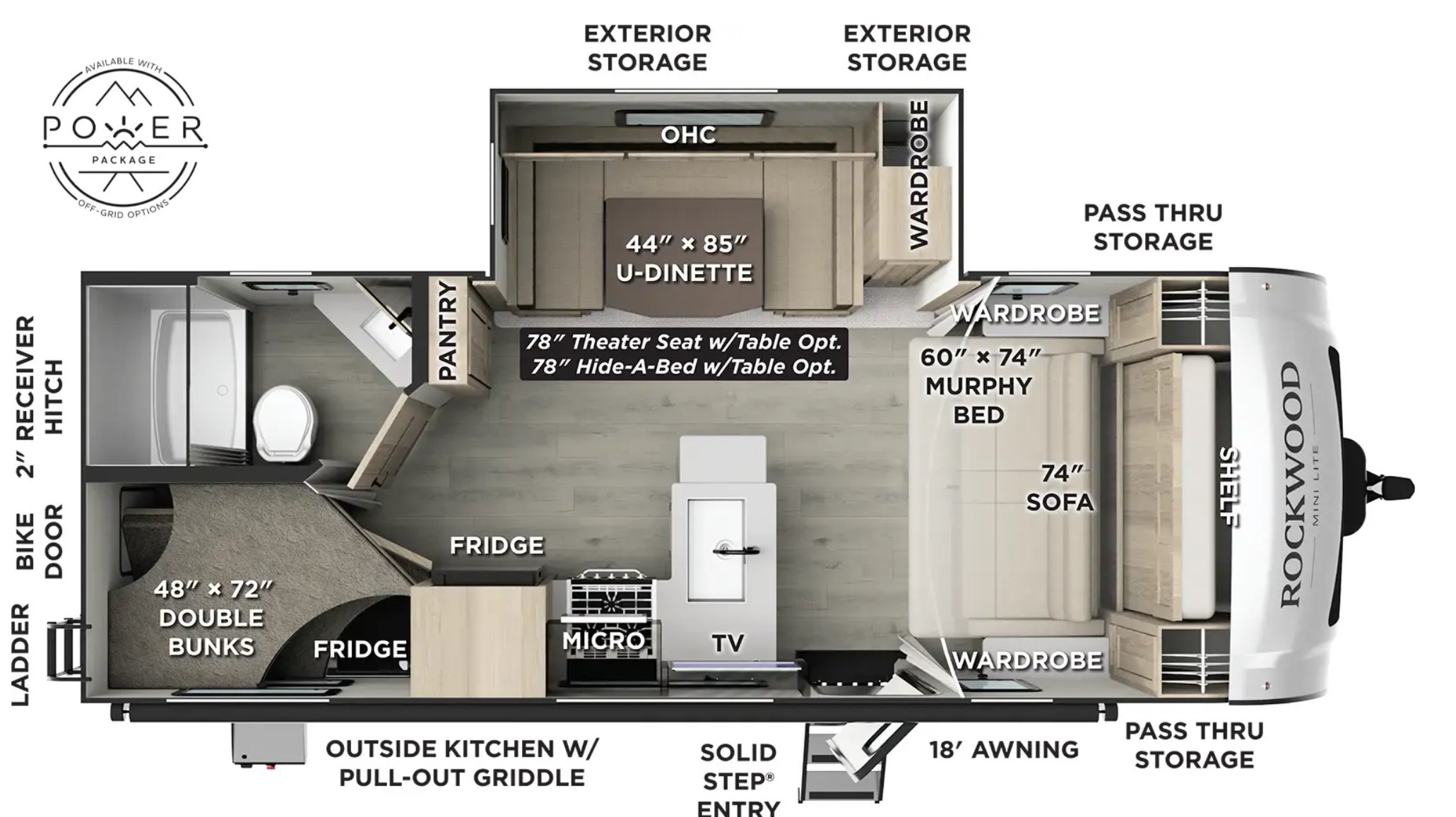The Rockwood Mini Lite 2509S delivers one of the most flexible layouts in the lightweight trailer market. With a Murphy bed, big slide-out, spacious dinette, double bunks, and an outside kitchen, it’s a fantastic option for families or couples who want maximum sleeping room without jumping into a big travel trailer.