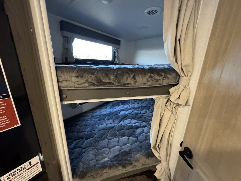 The back of the trailer features large double bunks, making this an ideal family layout. Each bunk is roomy and comfortable, and there’s great airflow thanks to side windows.