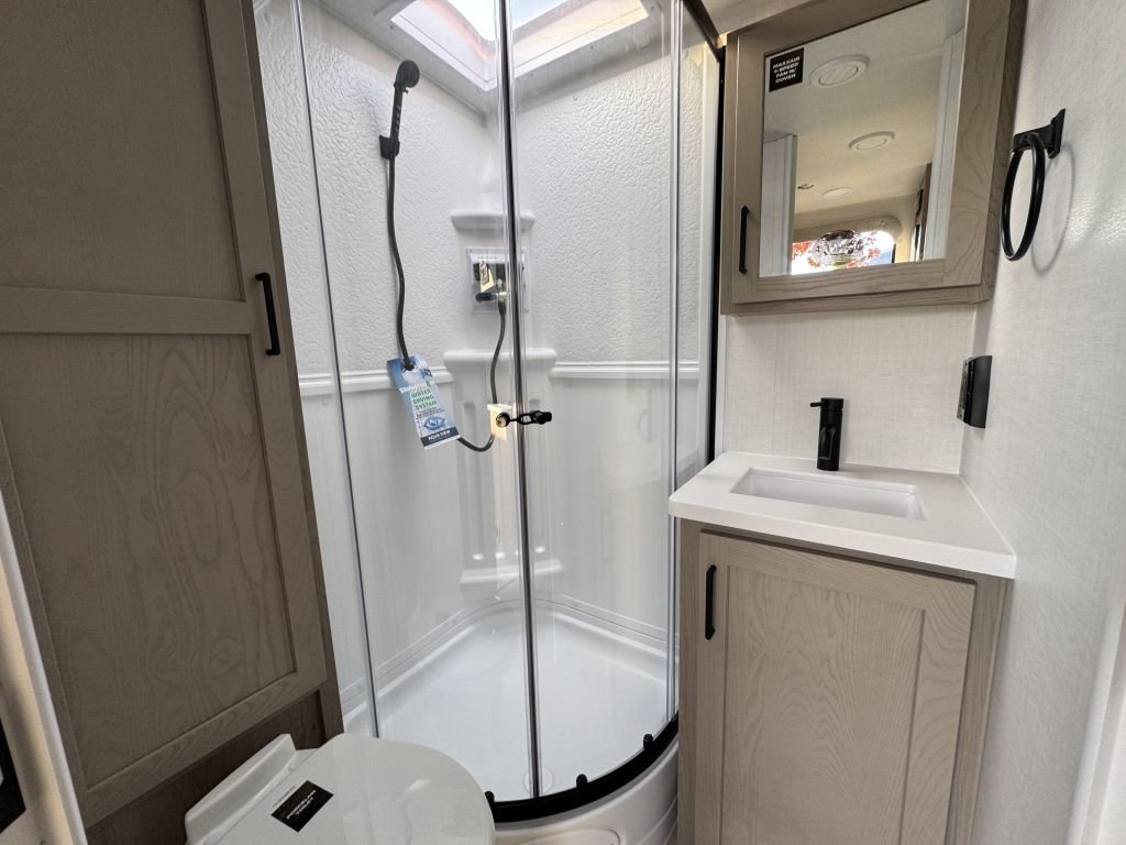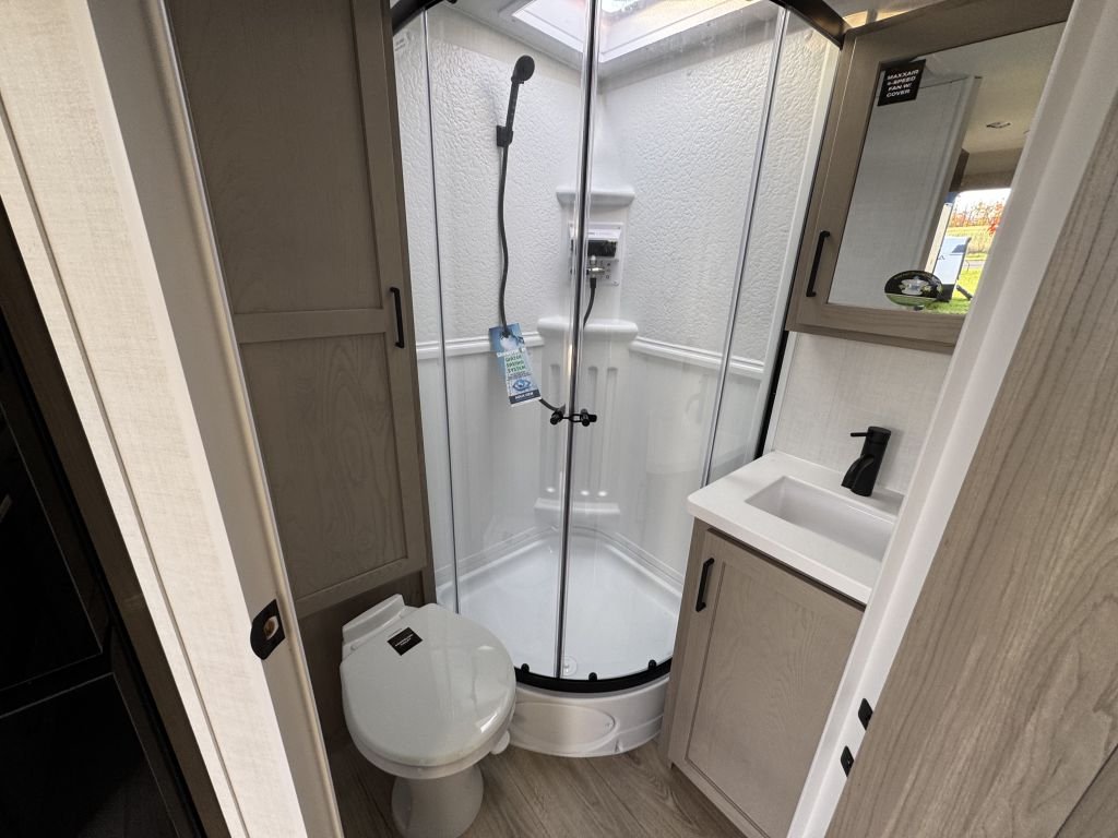 In the back of the trailer is a spacious corner bathroom, which feels much bigger than you’d expect in a unit this size: