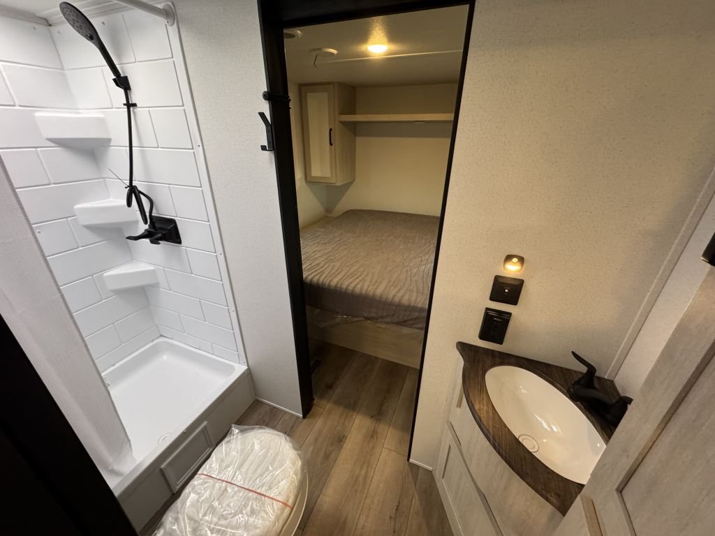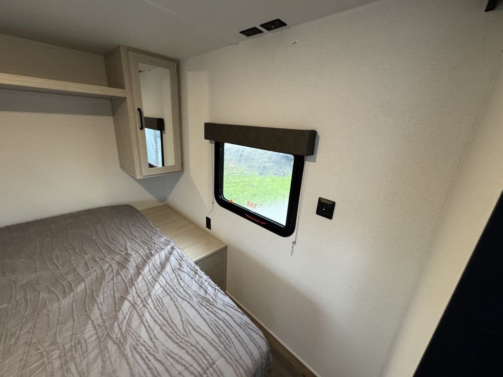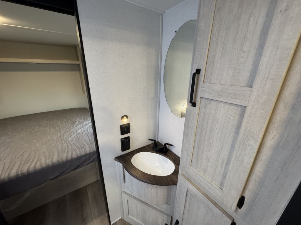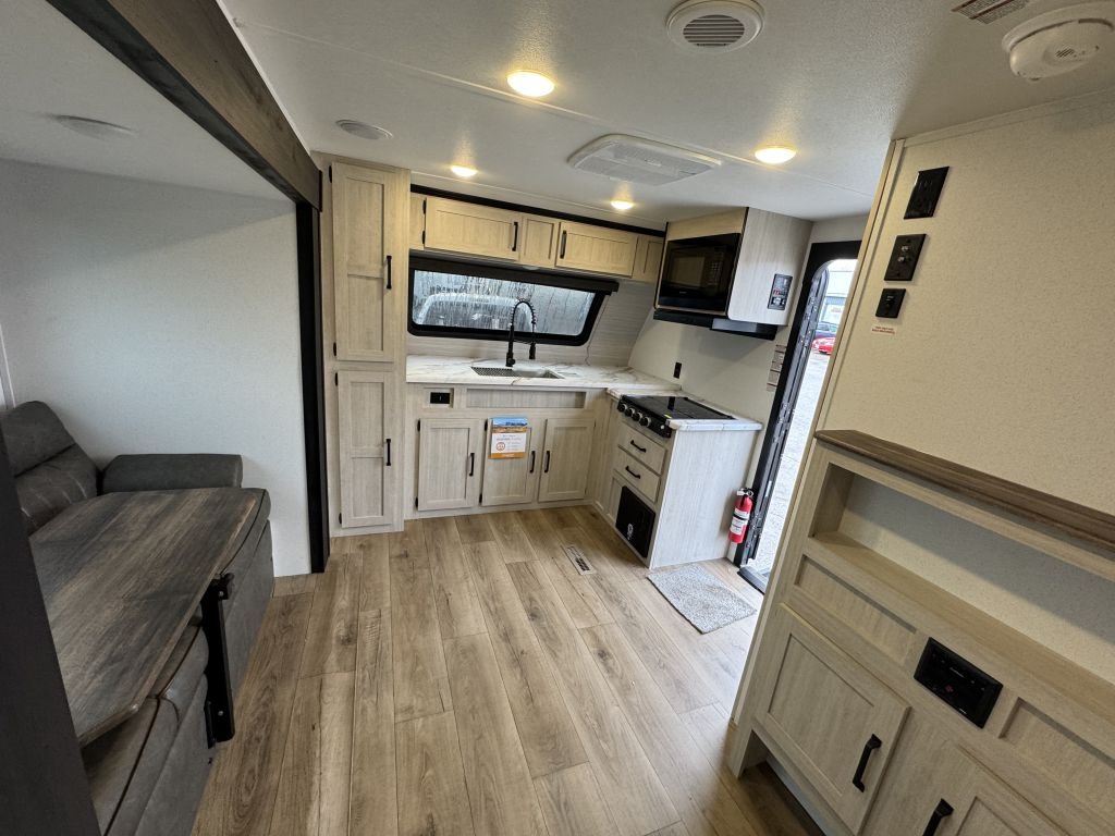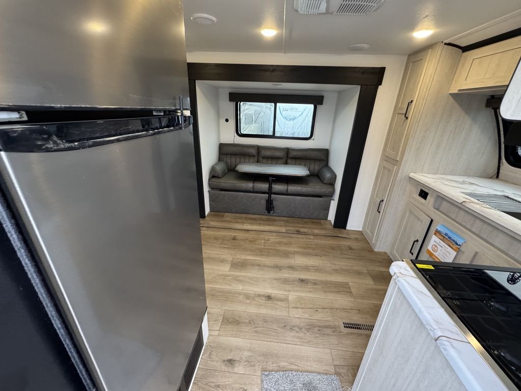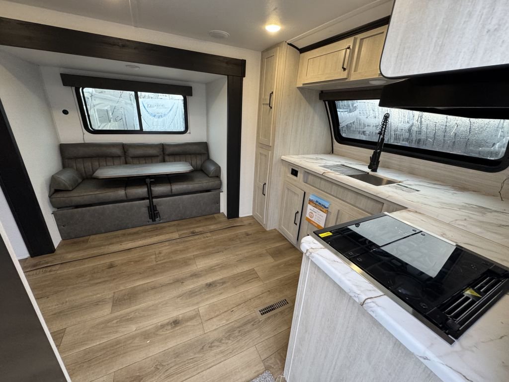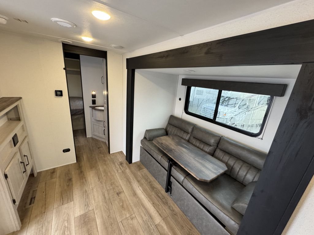 The slide-out booth dinette creates a cozy space for meals, games, or work—and converts quickly into a bed for extra guests. Across from the dinette, you’ll find a jackknife sofa that adds additional seating and sleeping capacity, making this floorplan versatile and family-friendly.