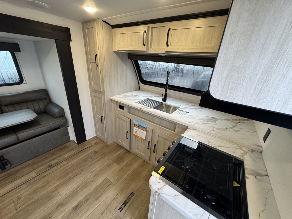As you step inside, you’ll find the rear kitchen tucked neatly along the back wall—organized, well-lit, and ready for camp cooking. It includes:
