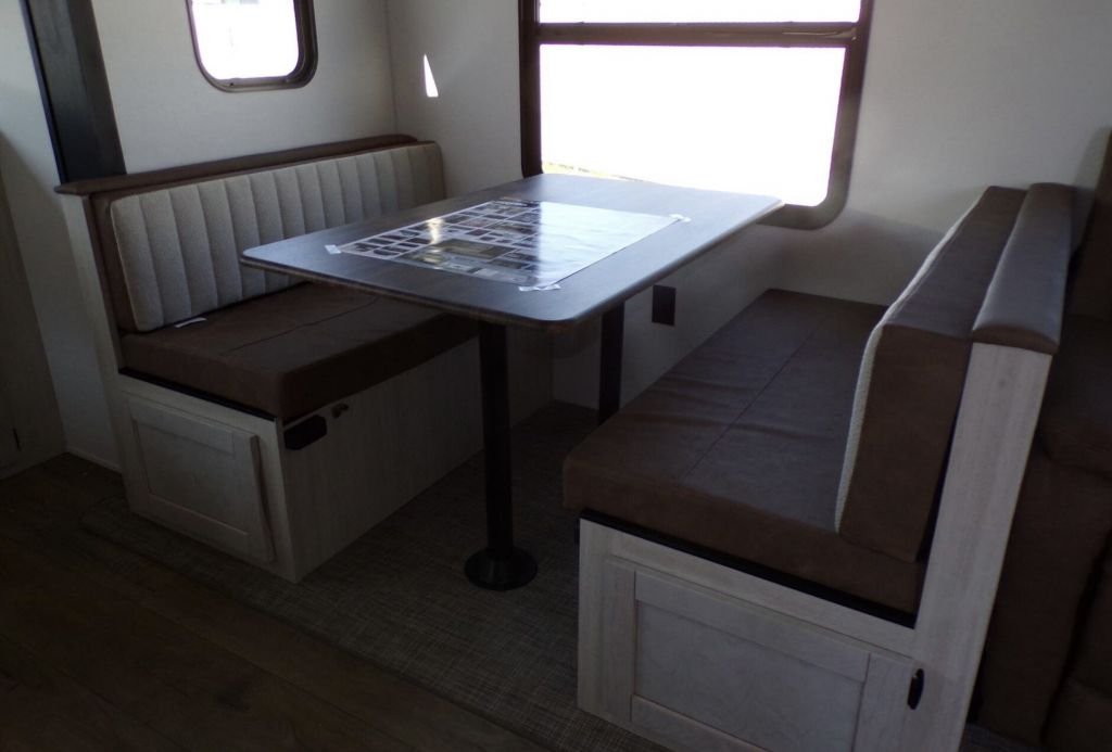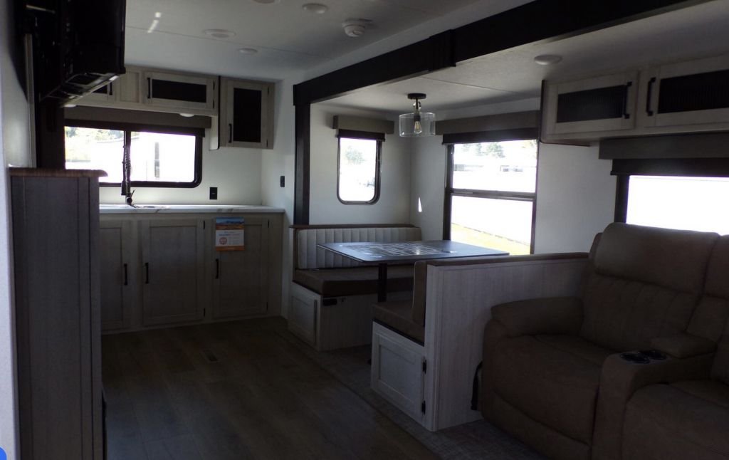 Moving forward from the kitchen, the main living area opens up thanks to a large slide-out that houses the seating and dining space.