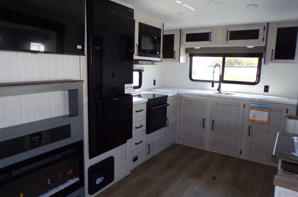 At the very back of the trailer you’ll find the rear kitchen, one of the highlights of this model. The layout gives you tons of counter space and keeps the cooking area separate from the main living space.