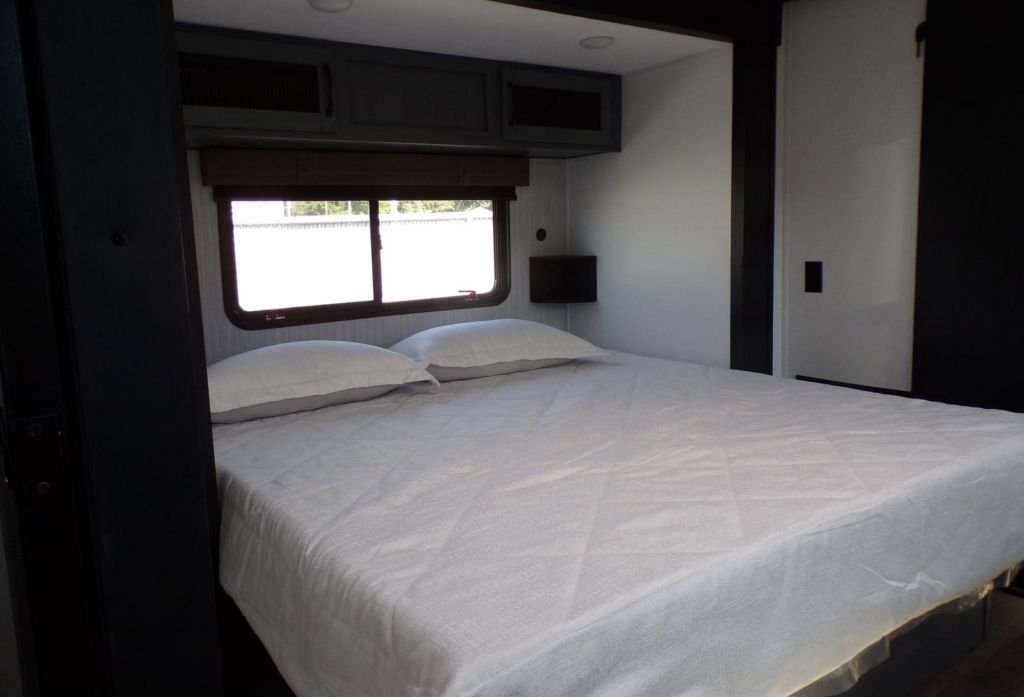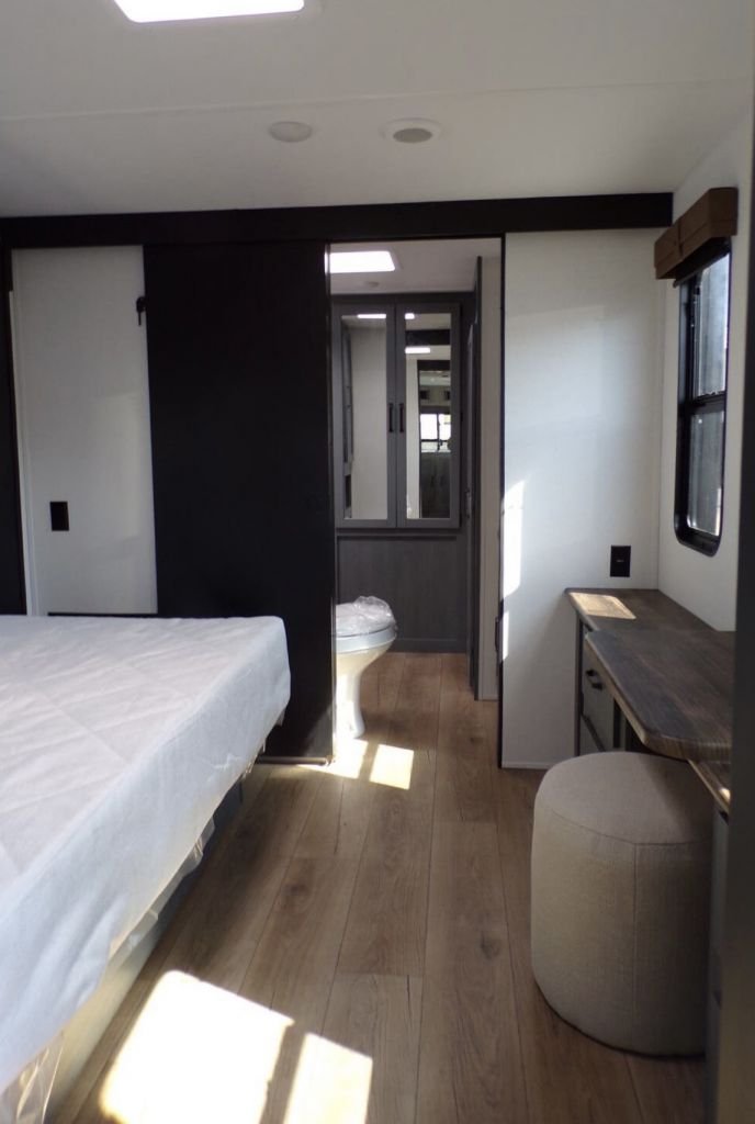 This layout makes the bedroom feel much more like a residential space rather than a typical RV sleeping area.