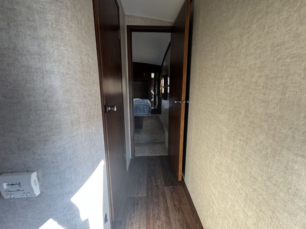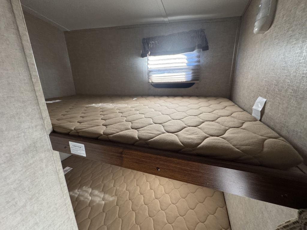 One of the standout features is the rear bunkhouse, offering double bunks and additional sleeping space, making this RV capable of sleeping up to 8 people comfortably. The private front master bedroom features a queen bed and ample storage, giving you separation and comfort after a long day.