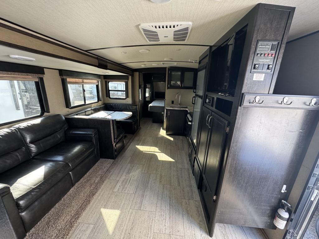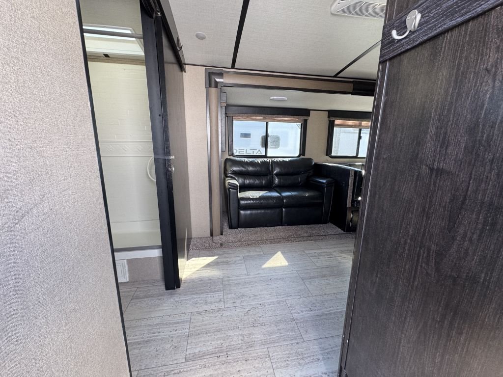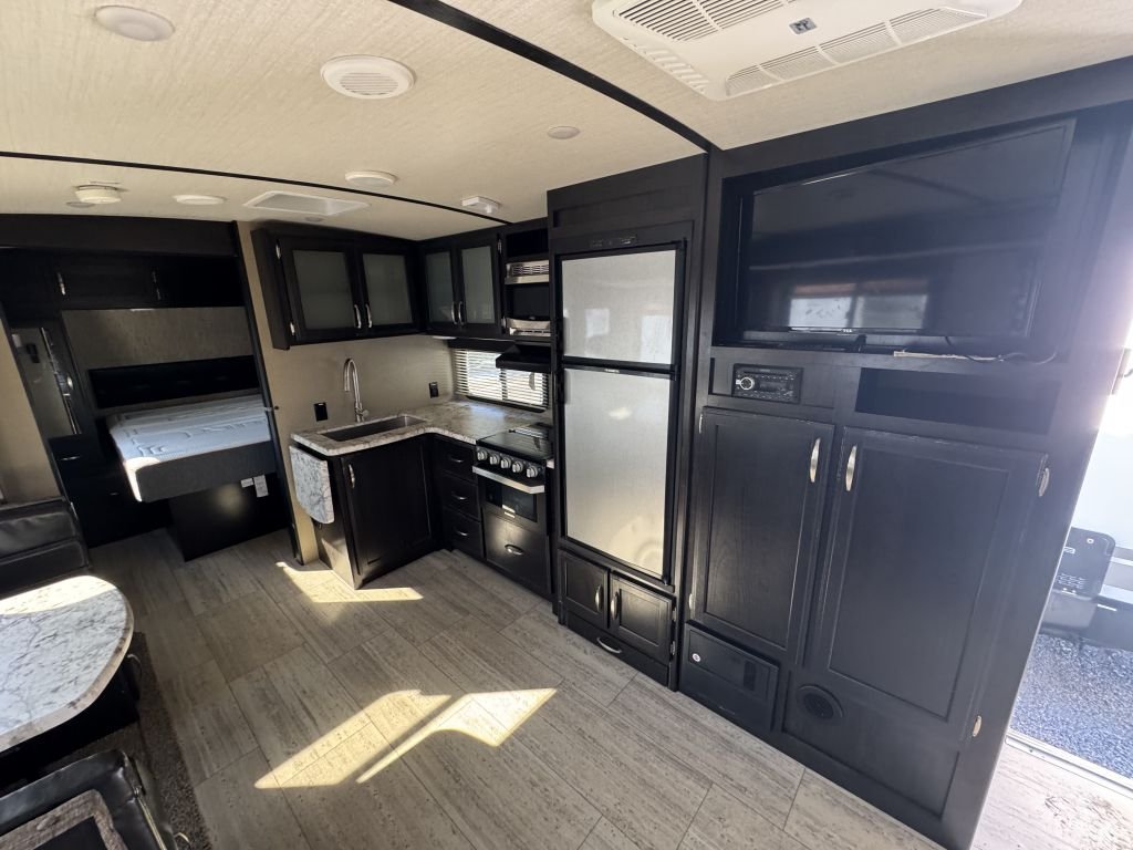 One of the standout features of this model is the oversized rear bathroom. Spanning the entire back of the trailer, it includes a large residential walk-in shower, plenty of counter space, linen storage, and excellent headroom—something rarely found in a trailer this size.