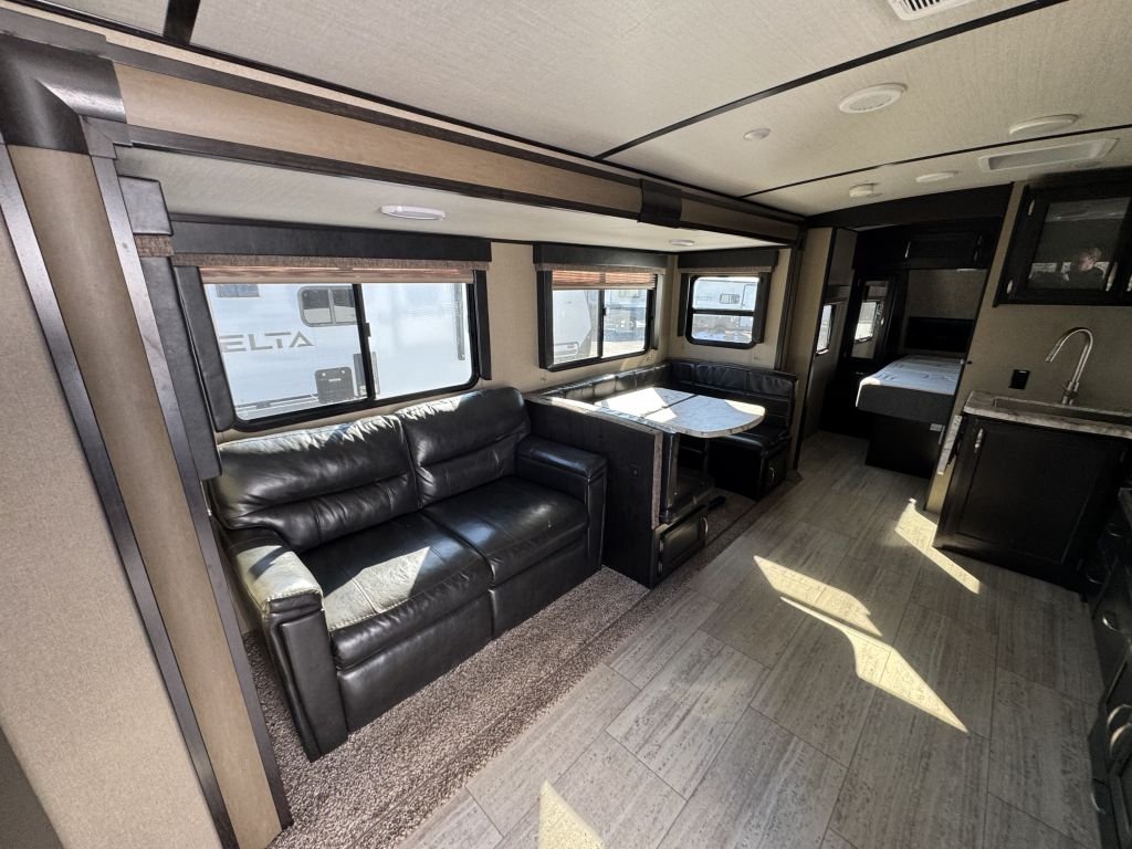 Inside, the main living area is bright and open thanks to a large slide-out that houses the U-shaped dinette and sofa. The oversized panoramic windows and 81" ceiling height create an airy feel, making it a comfortable space to relax or entertain.