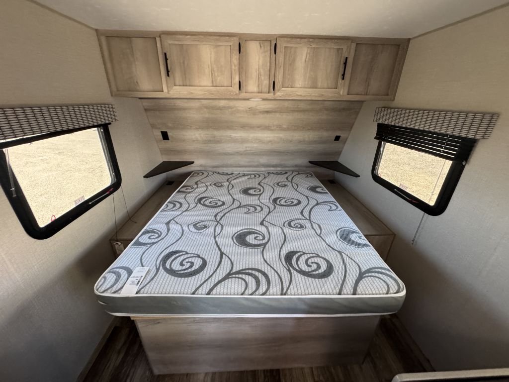 At the back of the trailer, you’ll find the queen bed that makes this model ideal for couples: