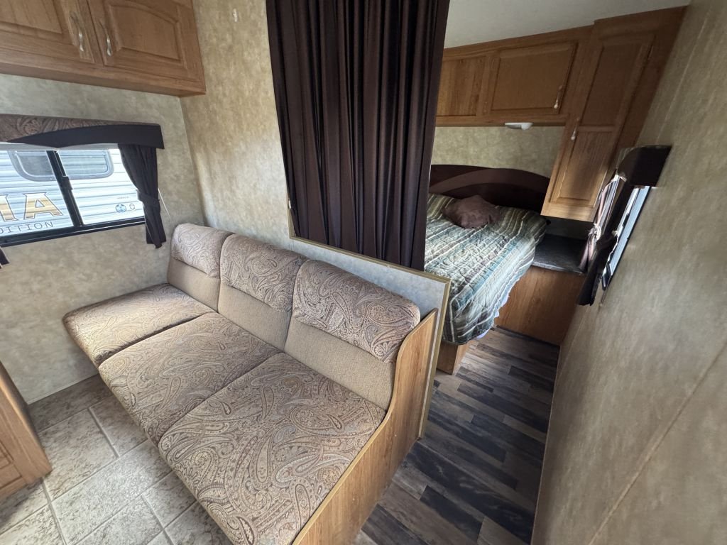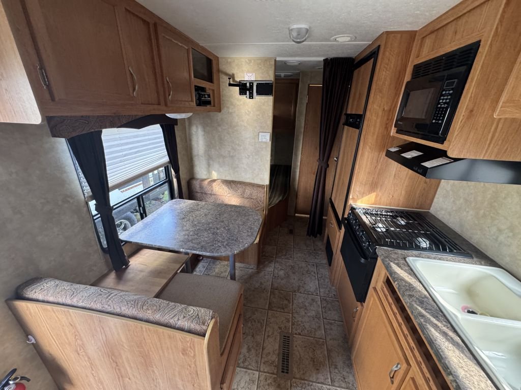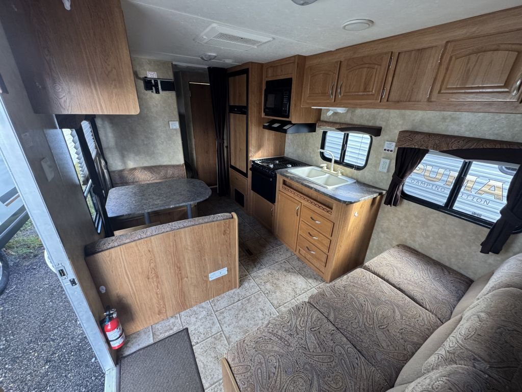 Step through the main entry and you’ll find a cozy, open living area that feels instantly welcoming. The jackknife sofaand booth dinette provide comfortable seating during the day and convert easily into extra sleeping space at night. Large windows let in plenty of natural light, creating a bright, cheerful atmosphere for relaxing after a day outdoors.